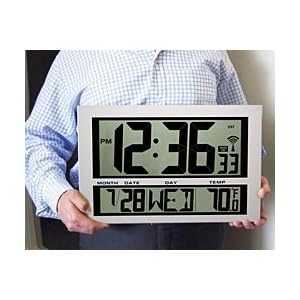 Jumbo Wall Clock - Easily read from 30 feet away, this large digital clock simultaneously displays the time, date, and temperature. A controlling radio signal from NIST in Boulder, Colorado automatically adjusts the clock to its precise time, which can be shown as 12 hour AM/PM or 24 hour international time. A calendar displays the month, date, and day of the week. Temperature readings are selectable in Celsius or Fahrenheit. -- Additional features include **a humidity display **daily alarm and snooze function **low battery indicator. -- Includes two built-in table stands. Requires four AA batteries, not included. -- Size: 28 x 42.5 x 5cm.