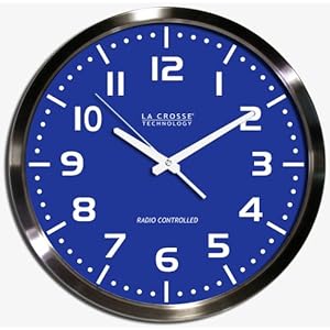 16 inch brushed aluminum wall clock features atomic time and automatic updates for Daylight saving time. Large numerals and metal hands. Royal blue dial and white numbers.